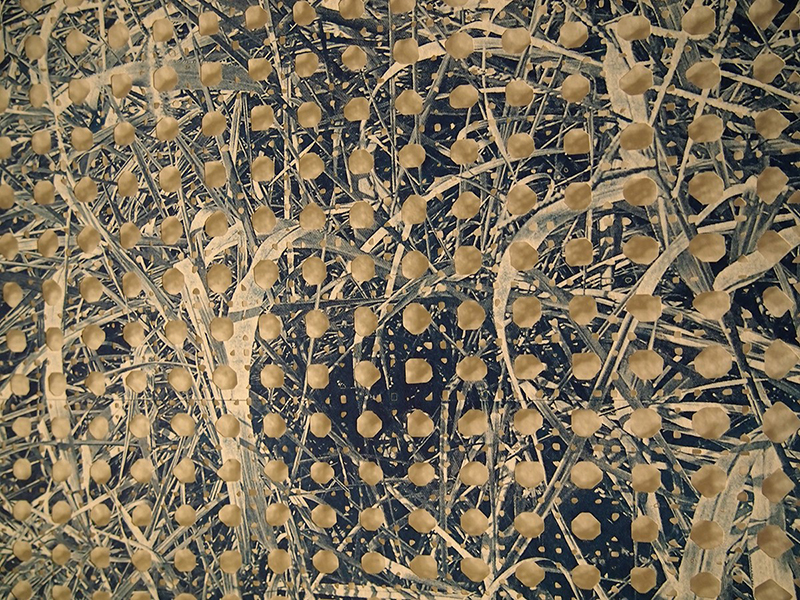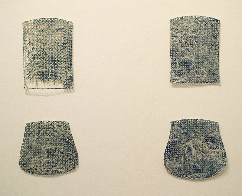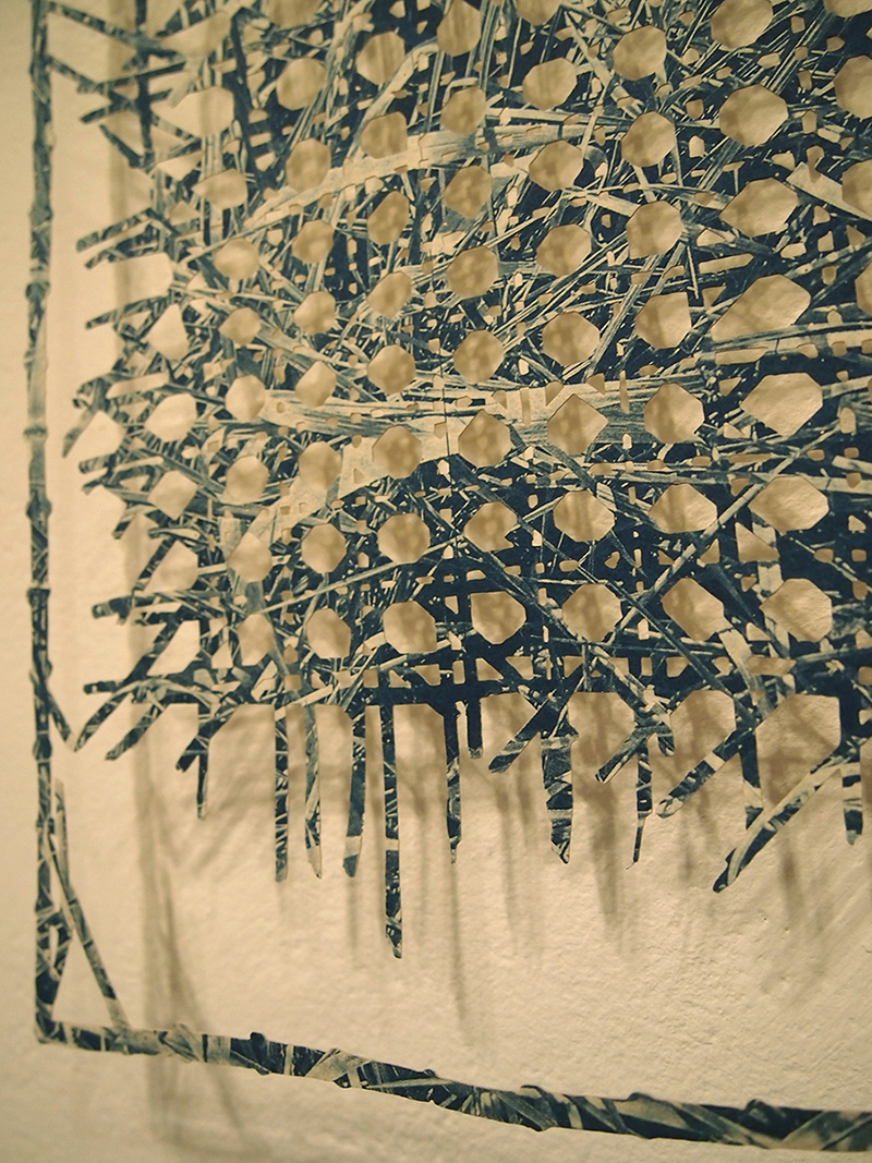 This is cyanotype printed on cut paper chair caning. The cut paper faithfully reproduces the caining from two different rocking chairs, one of them is damaged and one is whole. The image printed is a photograph of grasses which refers to time and the materiality of the caining itself. |